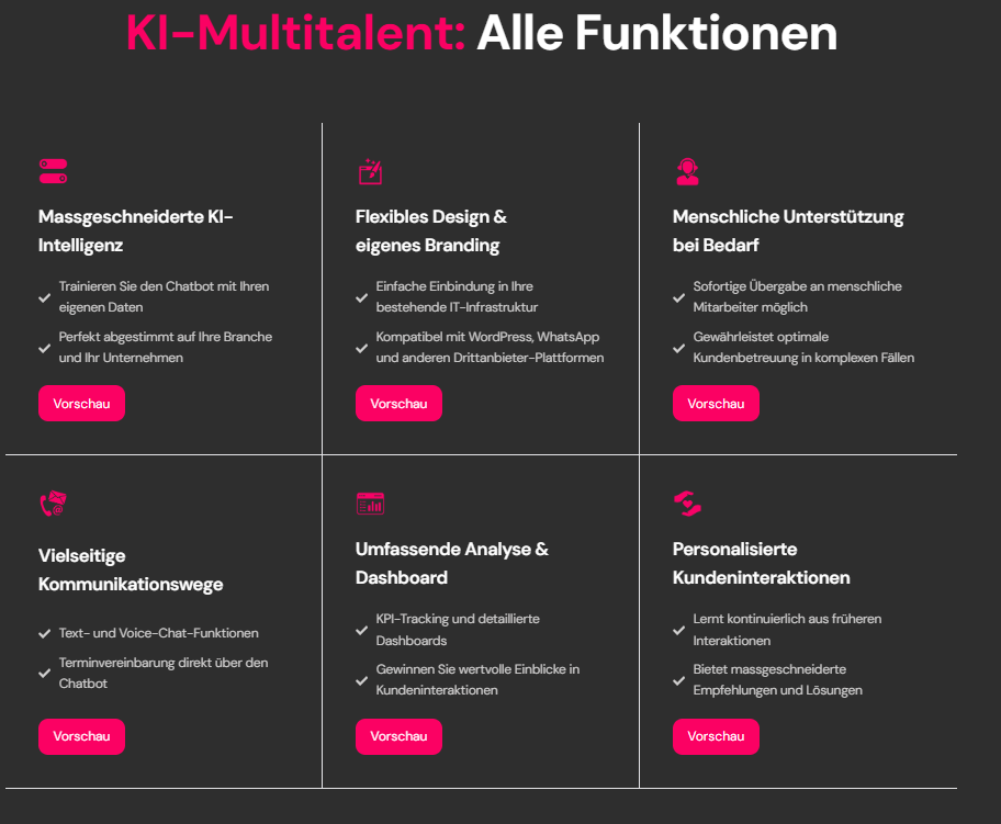Bereitstellung und Integration intelligenter Chat-Assistenten, welche maßgeschneidert auf die Bedürfnisse unserer Kunden abgestimmt sind. Zu den wesentlichen Vorteilen zählen: